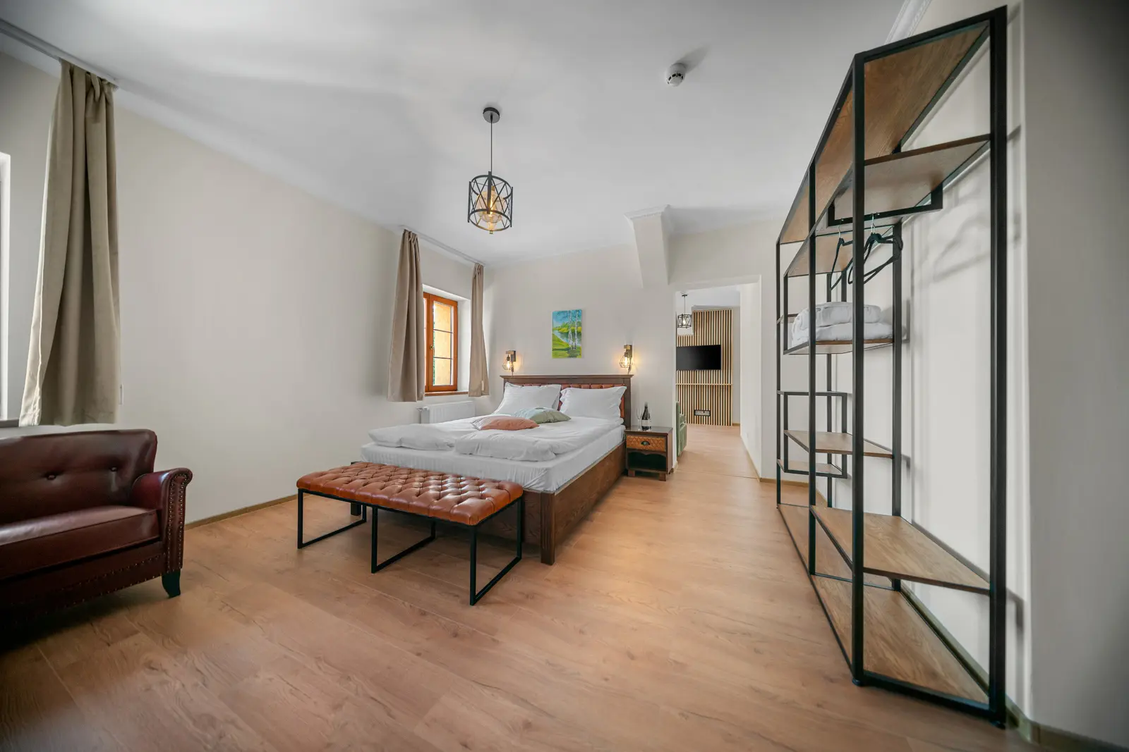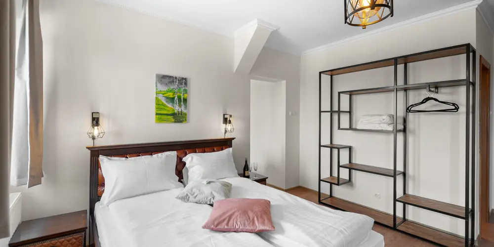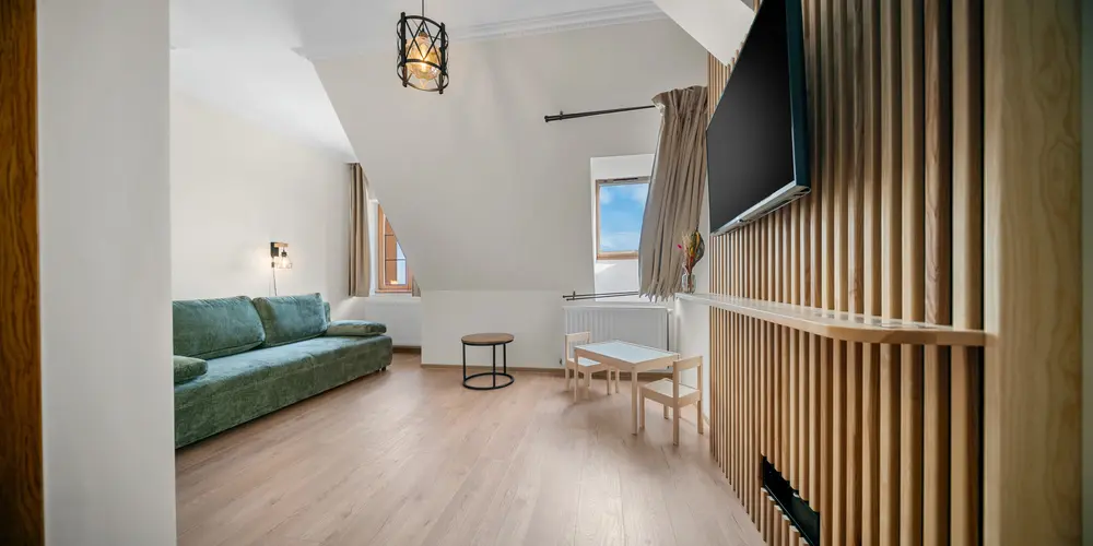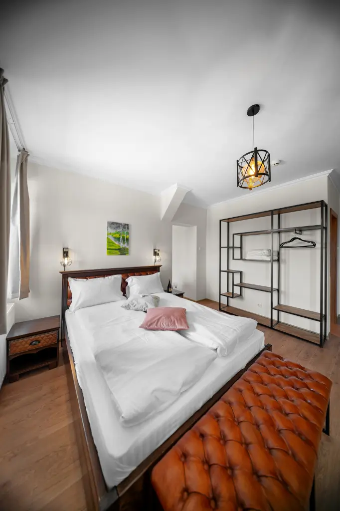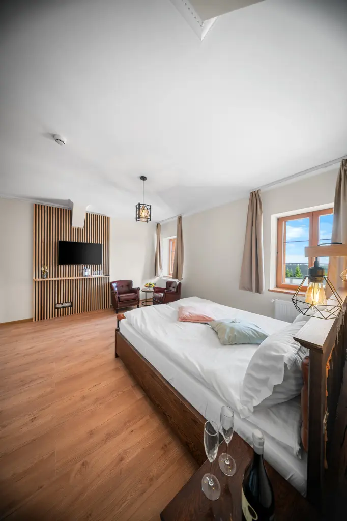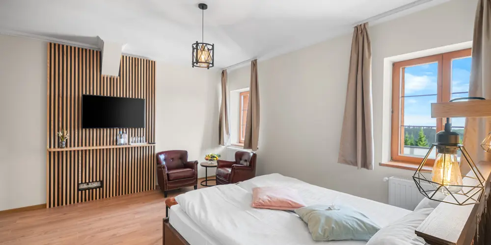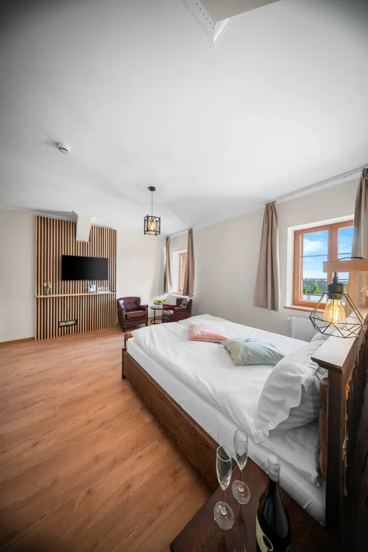 Tágas, elegáns és modern berendezésű szoba, amely minden kényelmet biztosít a pihenéshez. Panorámás kilátás a Hargita hegyvidékére és exkluzív wellness-élmény a szálloda közelségében.