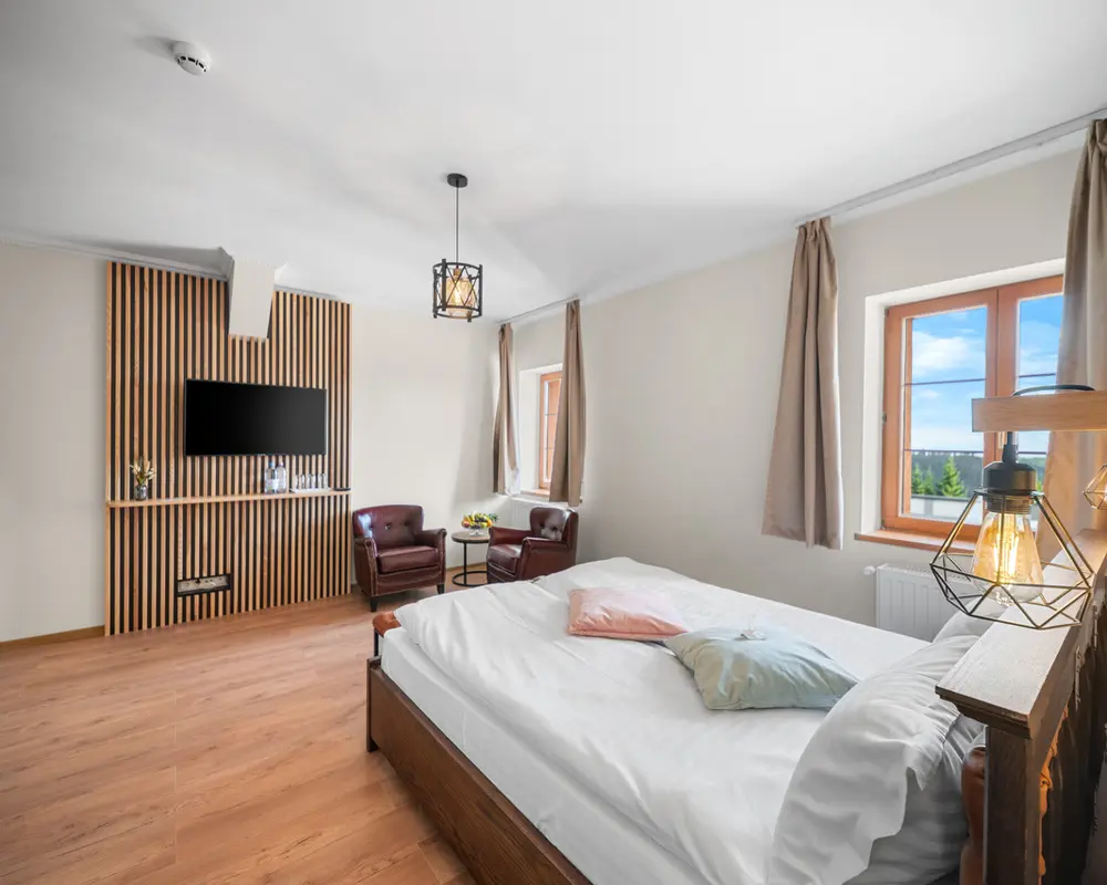 Tágas, elegáns és modern berendezésű szoba, amely minden kényelmet biztosít a pihenéshez. Panorámás kilátás a Hargita hegyvidékére és exkluzív wellness-élmény a szálloda közelségében.