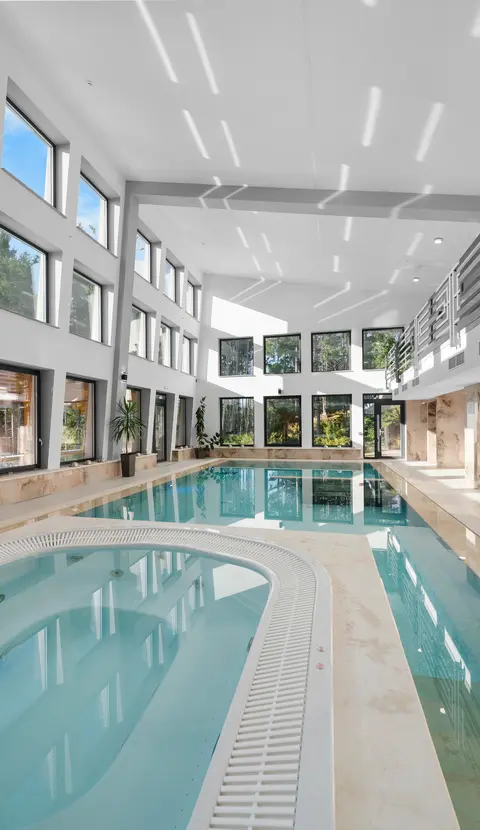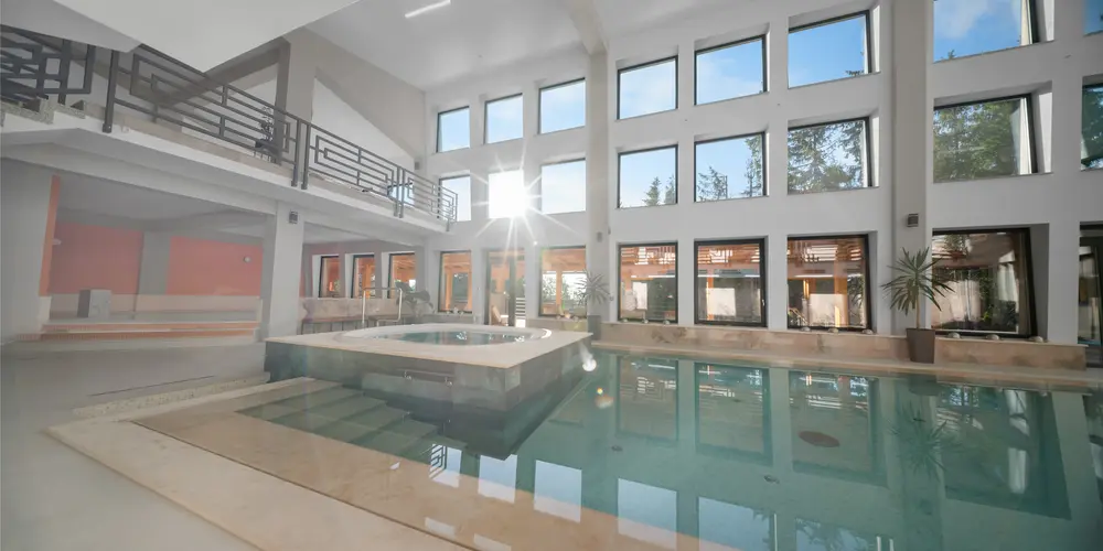 Piscina interioară principală are 12 metri lungime și 5 metri lățime, cu adâncimi între 104 și 145 cm, ideală pentru înot și relaxare. Piscina pentru copii are 4,5 metri lățime și 40 cm adâncime, oferind distracție în siguranță pentru cei mici, în timp ce părinții se pot odihni.
