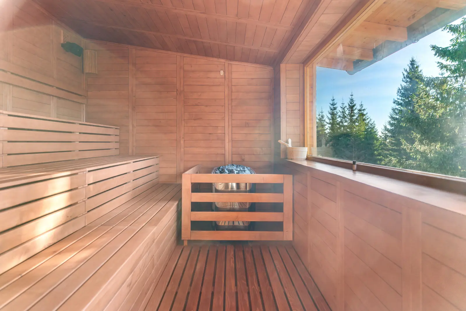 Zona de saune include 1 saună cu aburi, 1 saună infraroșu și 2 saune finlandeze, precum și o saună panoramică pe terasă, de unde oaspeții se pot bucura de minunile naturii în timpul relaxării.